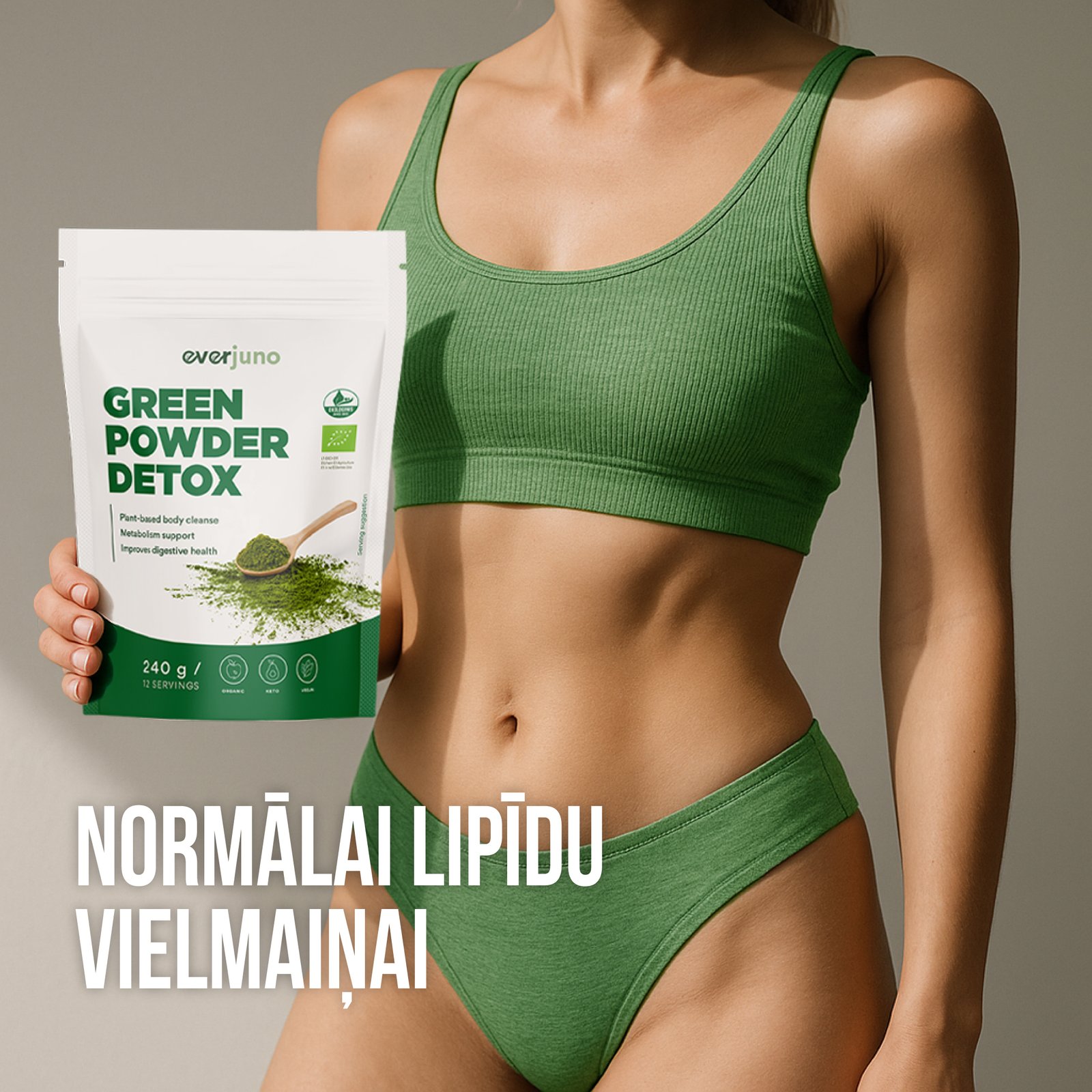 Sastāvdaļas: Ābolu pulveris*, zirņu proteīna pulveris*, banānu pulveris*, dateļu pulveris*, kaņepju sēklu proteīna pulveris*, upeņu pulveris*, agaves inulīns*, zilaļģu biomasas (spirulīnas) pulveris*, guāras sveķu biezinātājs*, spinātu pulveris*, lapu kāpostu (kale) pulveris*, stēvijas lapu ekstrakta pulveris*, sējas lucernas pulveris*, kviešu asnu pulveris*, miežu asnu pulveris*, mikroaļģu hlorellas pulveris*, zaļo kafijas pupiņu pulveris*, ingvera pulveris*, kanēļa pulveris*, kajēnas paprikas pulveris*. Produkts var saturēt lipekli saturošu graudaugu, sezama, sinepju, piena, zemesriekstu, citu riekstu daļas un sulfītu, kas dabiski sastopami spirulīnas pulverī. Satur kofeīnu (2,26 mg/100 g produkta). Nav ieteicams bērniem un grūtniecēm. *Ekoloģiskas sastāvdaļas. Var saturēt glutēnu saturošu graudaugu, sezama, sinepju, sojas pupiņu, lupīnu, piena, zemesriekstu, citu riekstu un sulfītu pēdas, kas dabiski rodas spirulīnas pulverī. Satur kofeīnu (2,26 mg/100 g produkta). Nav ieteicams bērniem vai grūtniecēm. Produkts satur daudz olbaltumvielu un šķiedrvielu. Olbaltumvielas veicina muskuļu masas augšanu. Lietot kā daļu no daudzveidīga un sabalansēta uztura. Uzglabāt vēsā, sausā vietā, sargāt no tiešiem saules stariem. Ieteicams līdz: skatīt uz iepakojuma. Sertifikācijas iestādes kods LT-EKO-001